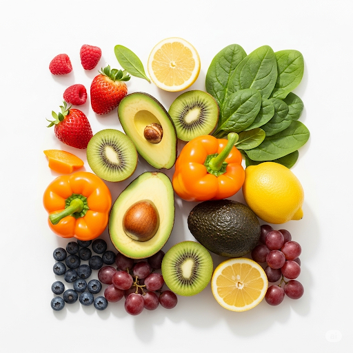 신선한 과일과 채소 등 피부에 좋은 식단입니다. 내면의 아름다움이 중요하다는 것을 보여줍니다.