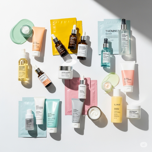 수많은 피부 관리 제품들이 진열된 모습입니다. 내게 맞는 제품을 찾는 즐거움을 표현합니다.