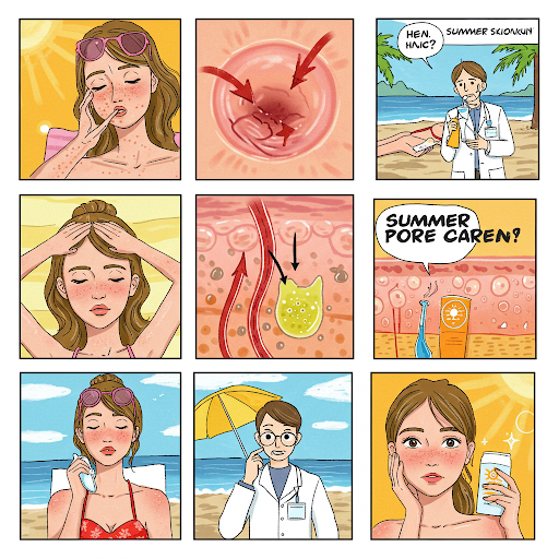 여름엔 온도가 상승하면서 피지선이 더 활발하게 작용합니다. 피부는 자연스럽게 수분을 증발시키지 않기 위해 피지를 과도하게 분비하게 되죠. 이렇게 분비된 피지는 모공을 막고, 블랙헤드, 화이트헤드, 염증성 여드름으로 이어지게 됩니다.